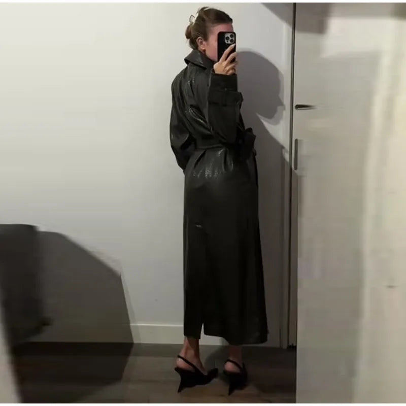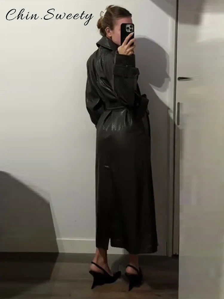 Elegant Women's Double Breasted Long Leather Coat With Belt Lapel Full Sleeve Pockets Jacket 2025 Autumn Winter Lady Outwear New