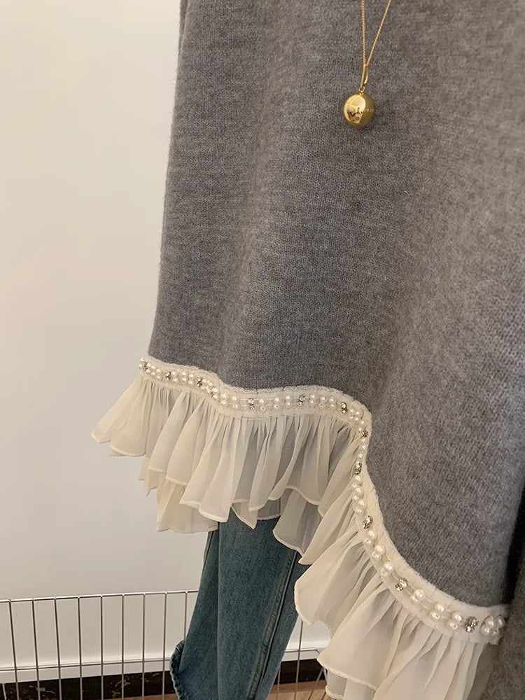 New Winter Sweet Loose Beaded Ruffled Pink Sweater for Women Fashion Versatile Casual and Elegant Knitted Sweater
