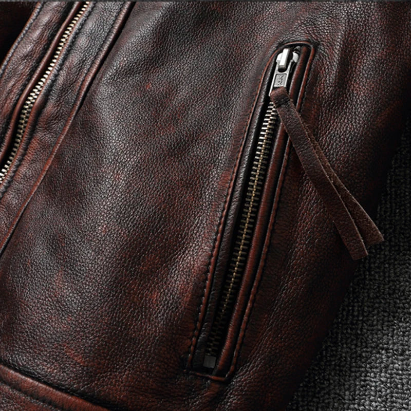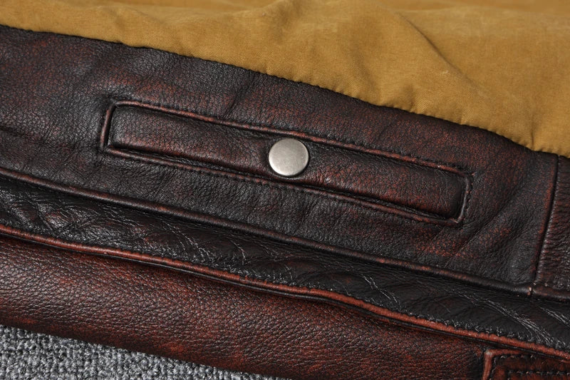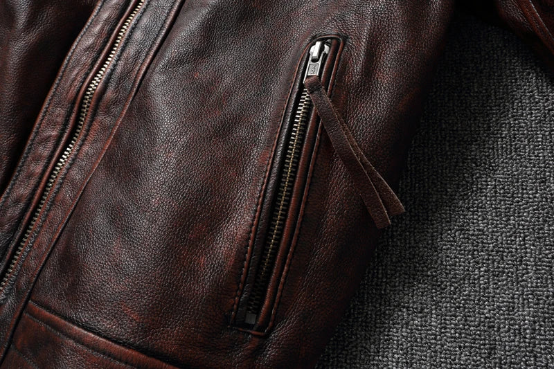 Top layer Cow Oversized Leather Jacket Red-Brown American retro Motorcycle Style Color Distressed High Sense Coat