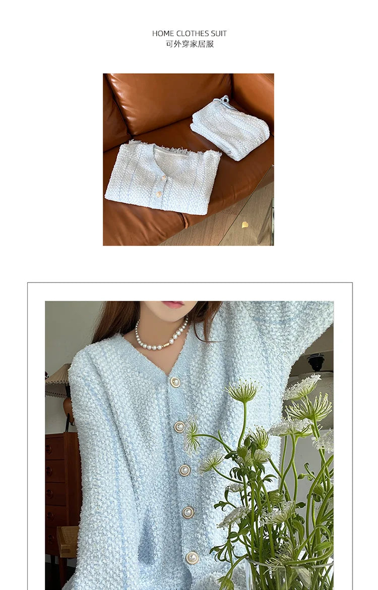 Winter Ins Sweet Tassel Cardigan Set Sleepwear Women's Winter Thick Warm Knitted Home Clothes Two Piece Set Light Blue
