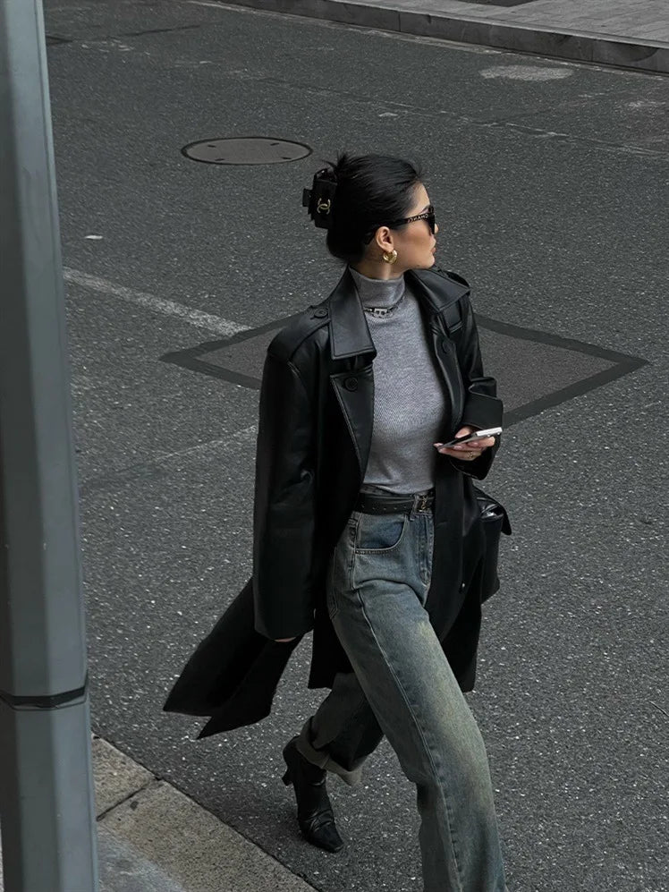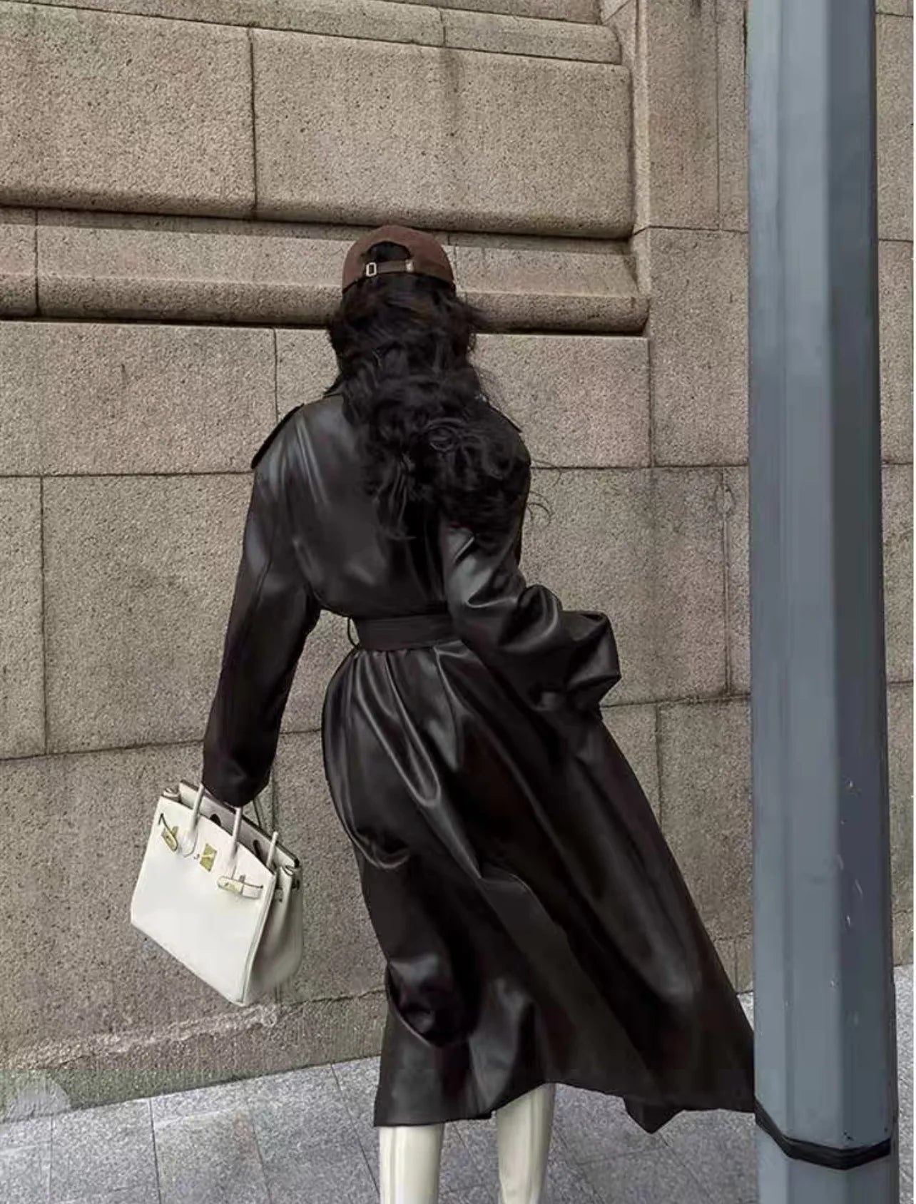 Women Faux PU Leather Coats Turn Down Collar Black High Waist Lace Up Long Jackets Casual Elegant Y2k Maxi Loose Windbreak